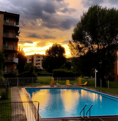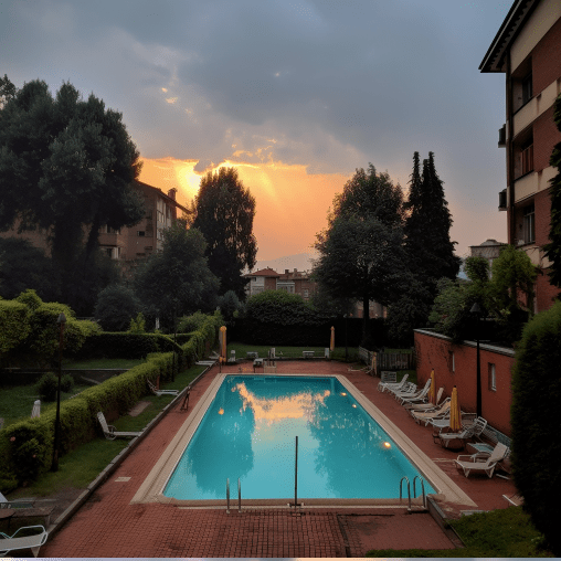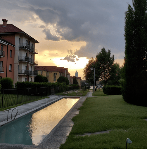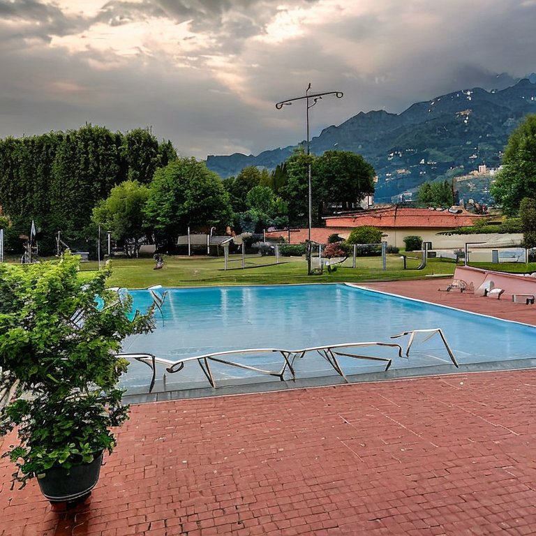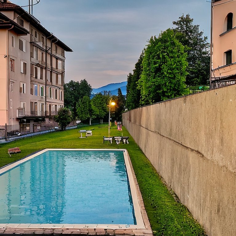 Prompt (generato dall’acquisizione della posizione): A evening photo taken at XXXXXXX, Turin. The weather is few clouds with temperature of 21 degrees. The date is Wednesday the 7 June 2023. There is a furniture, swimming pool and field nearby.