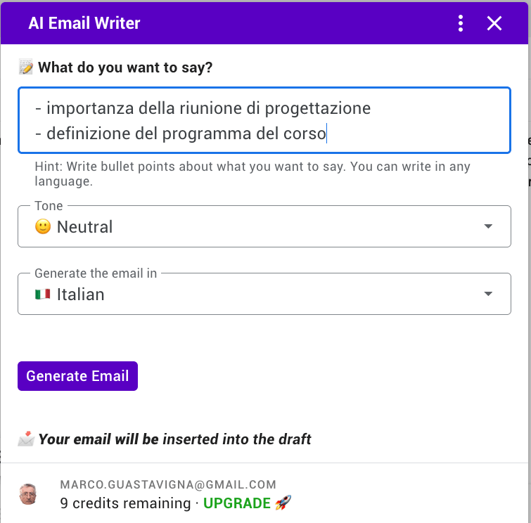 Ciao tutti [sic!], Spero che stiate tutti [sic!] bene. Volevo [sic!] informarvi dell’importanza della prossima riunione di progettazione e definizione del programma del corso. Durante questa riunione, avremo l’opportunità di discutere e definire i dettagli del corso, come gli obiettivi, i contenuti e le modalità di valutazione. Sarà un momento cruciale per assicurarci che il corso soddisfi le esigenze e le aspettative di tutti i partecipanti. Vi invito quindi a partecipare attivamente alla riunione e a condividere le vostre idee e suggerimenti. La vostra partecipazione è fondamentale per il successo del corso. Vi aspetto numerosi il prossimo martedì alle 10:00 presso la sala riunioni. Grazie e a presto! Marco