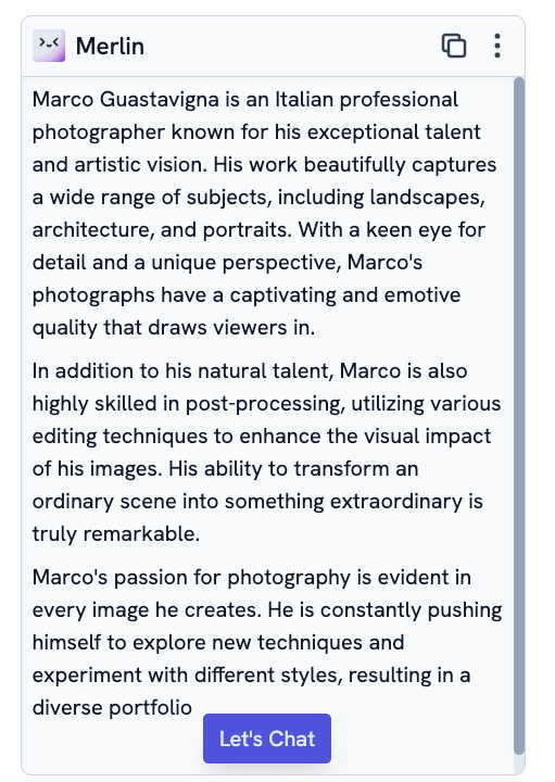 (Marco Guastavigna è un fotografo professionista italiano noto per il suo [sic! NdR] eccezionale talento e visione artistica. Il suo lavoro cattura magnificamente una vasta gamma di soggetti, tra cui paesaggi, architettura e ritratti. Con un occhio attento per i dettagli e una prospettiva unica, le fotografie di Marco hanno una qualità accattivante ed emotiva che attira gli spettatori.