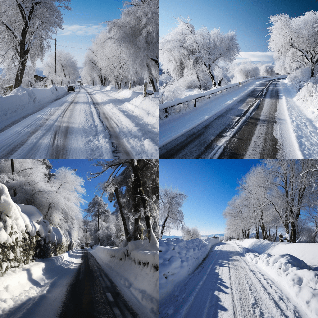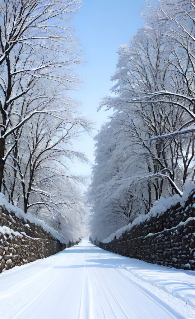 Prompt: La neve bianca ricopre ogni cosa: ci sono una larga strada in primo piano e un muretto di pietra coperto di neve. Sul manto stradale, appena visibili, ci sono le tracce del passaggio di un veicolo. Gli alberi sullo sfondo sono alti e ramificati e una spessa coltre bianca li copre.