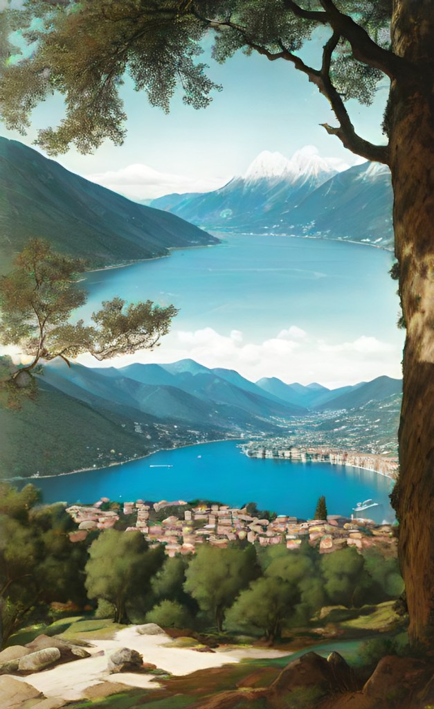 Prompt: Quel ramo del lago di Como, che volge a mezzogiorno, tra due catene non interrotte di monti, tutte a seni e a golfi, a seconda dello sporgere e del rientrare di quelli, vien, quasi a un tratto, a ristringersi, e a prender corso e figura di fiume, tra un promontorio a destra, e un’ampia costiera dall’altra parte.