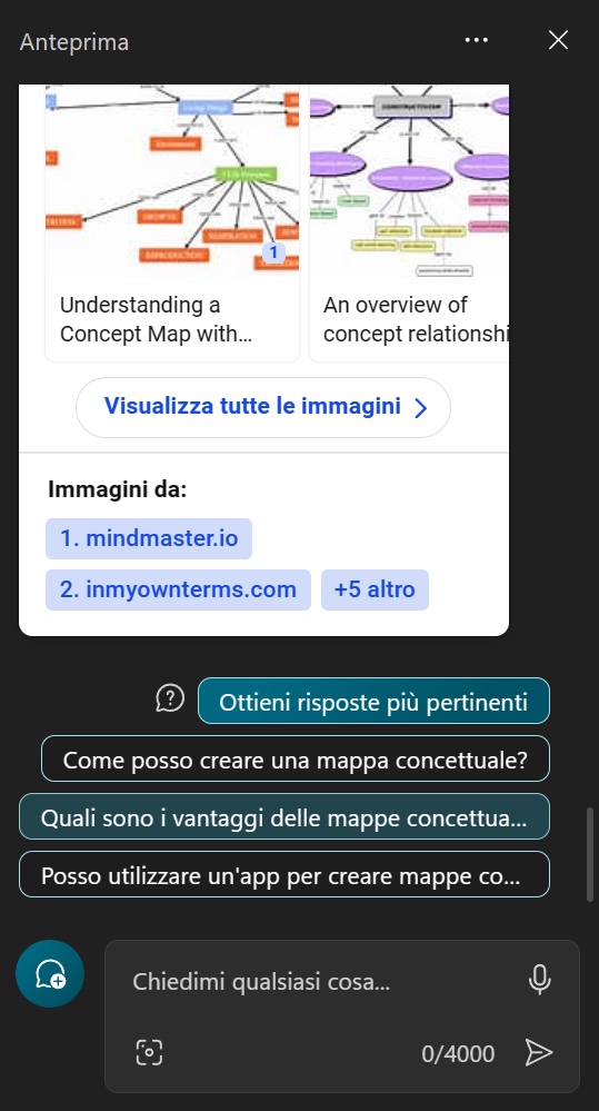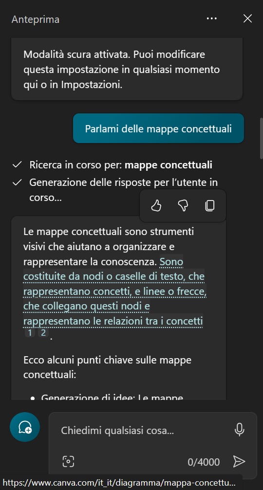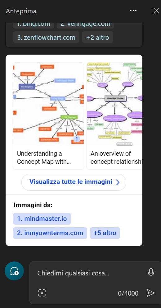 [Il principale argomento di contestazione dell’idea che i dispositivi di intelligenza artificiale violino il diritto d’autore è che i medesimi, accedendo ai contenuti disponibili via internet per il proprio addestramento e funzionamento successivo, costruiscano una “conoscenza diffusa” analoga a quella degli esseri umani e che non apporta un danno economico o di immagine alle fonti consultate. La sequenza di immagini allegata, che riproduce in orizzontale quanto fornitomi stamattina con scorrimento verticale nella finestra aperta da Copilot per Windows 11, dopo che l’ho attivato con l’ennesimo magheggio, sembra confermare la cosa: il “succo” culturale conferma infatti che il dispositivo ha costruito la propria immagine delle “mappe concettuali” accedendo alle frequentissime popolarissime (leggi: cliccatissime) castronerie in proposito]