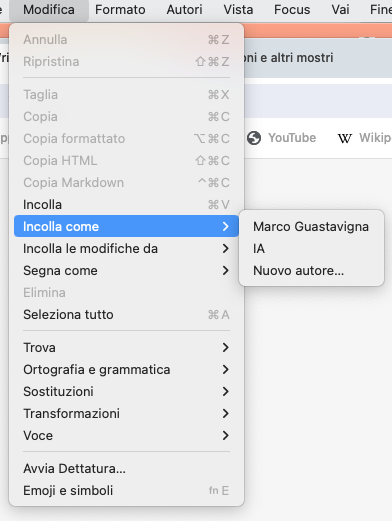 - Il menu “Incolla come” incolla il testo e indica l’autore contemporaneamente