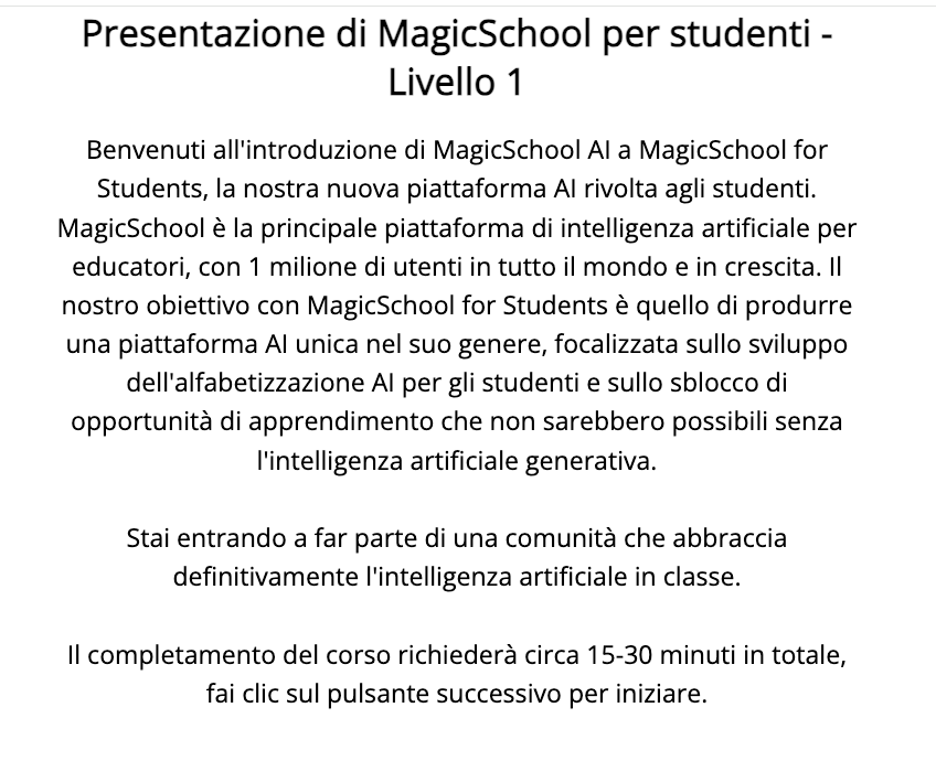 Alla fine del corso, avrete due opportunità per darci feedback su Magic School per gli studenti. Apprezziamo enormemente ogni commento, che ci aiuterà a migliorare il nostro prodotto per voi e i vostri studenti. Grazie per aver partecipato a questo corso introduttivo, ci auguriamo che lo troviate utile e stimolante!
