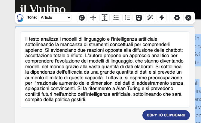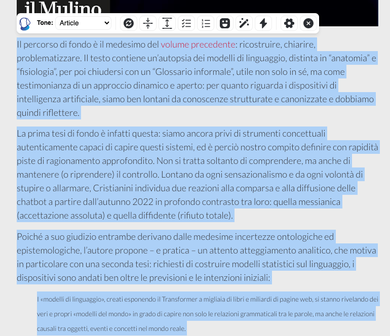 7 aprile 20247 aprile 2024 Marco Guastavigna Molto nulla per fare rumore? Il modello di assistenza alla scrittura di Shakespeare toolbar: schema originale e traduzione automatica Articolo di partenza La Machina sapiens di Cristianini Compare l’accrocco… Il risultato della scelta Condividi: Fai clic per condividere su X (Si apre in una nuova finestra) X Fai clic per condividere su Facebook (Si apre in una nuova finestra) Facebook Mi piace Caricamento... Correlati