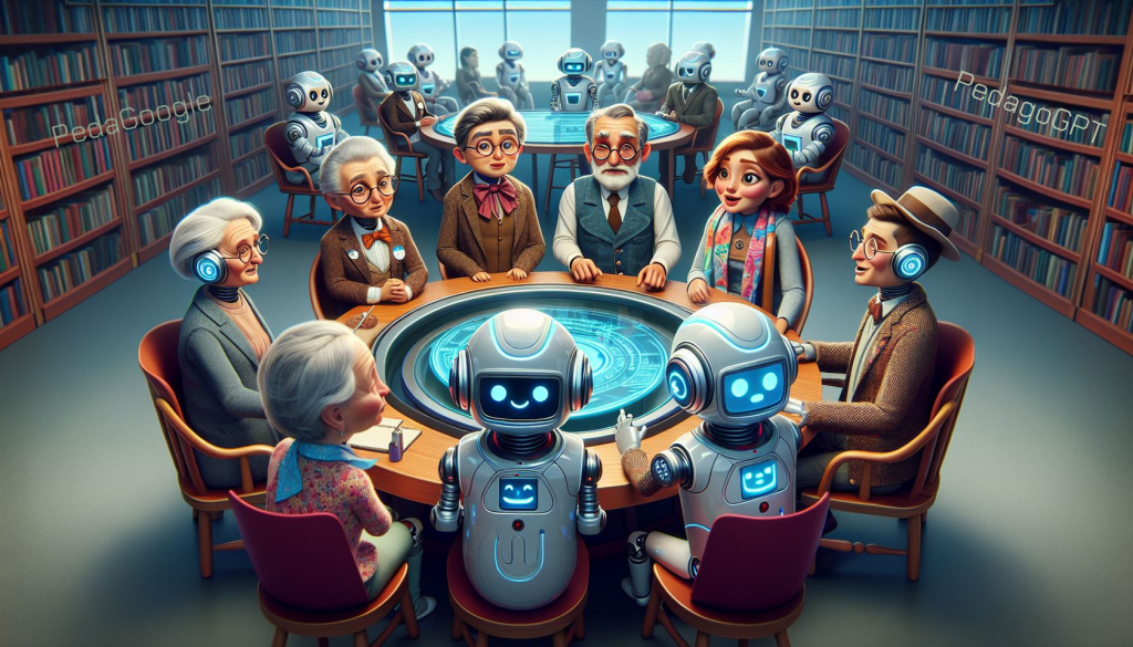 Nell’immagine vediamo un gruppo di personaggi stilizzati in un ambiente che sembra essere una biblioteca, dato che alle spalle si notano numerosi scaffali pieni di libri. I personaggi sono seduti intorno a un tavolo rotondo su cui è posizionato un ologramma che ricorda una specie di mappa o interfaccia circolare. Tra i personaggi ci sono sia esseri umani che robot.
