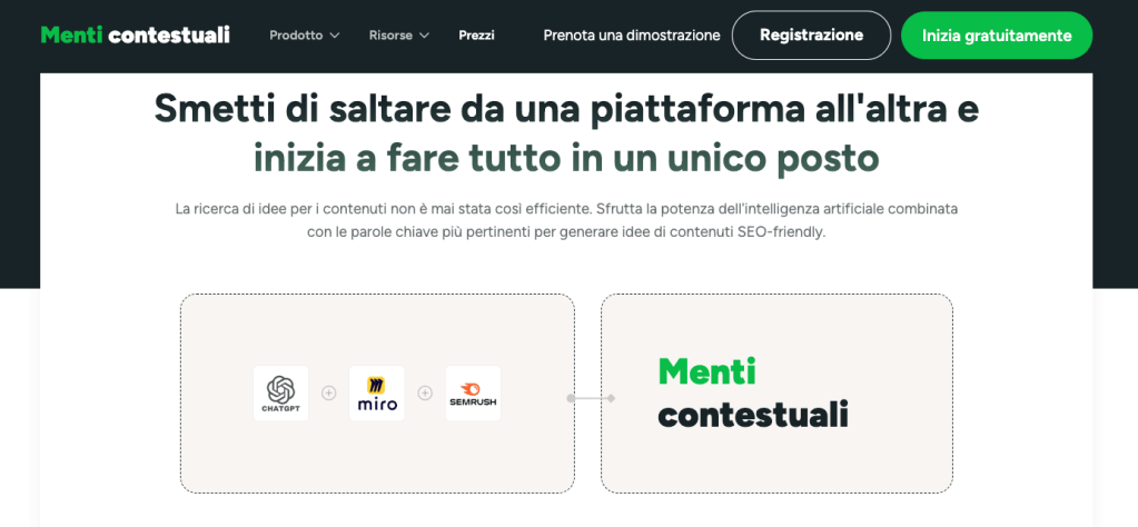 [09:03] (https://www.youtube.com/watch?v=MdkAIIbKs5Y&t=543) ContextMinds ti consente di trovare parole chiave, domande e articoli per la creazione di contenuti.