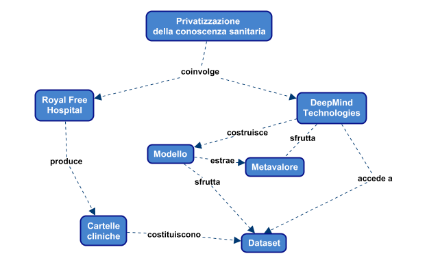 La mappa concettuale mette in evidenza un flusso di informazioni in cui i dati sanitari dei pazienti (le cartelle cliniche) vengono raccolti dagli ospedali e poi sfruttati da aziende come DeepMind, che utilizzano questi dati per addestrare modelli di intelligenza artificiale. Questo processo solleva il tema della “privatizzazione della conoscenza sanitaria”, ovvero il fatto che entità private stanno acquisendo sempre più controllo su dati estremamente sensibili, generando un nuovo tipo di valore, il metavalore, che va oltre la semplice gestione clinica dei dati e coinvolge anche aspetti economici, etici e sociali.