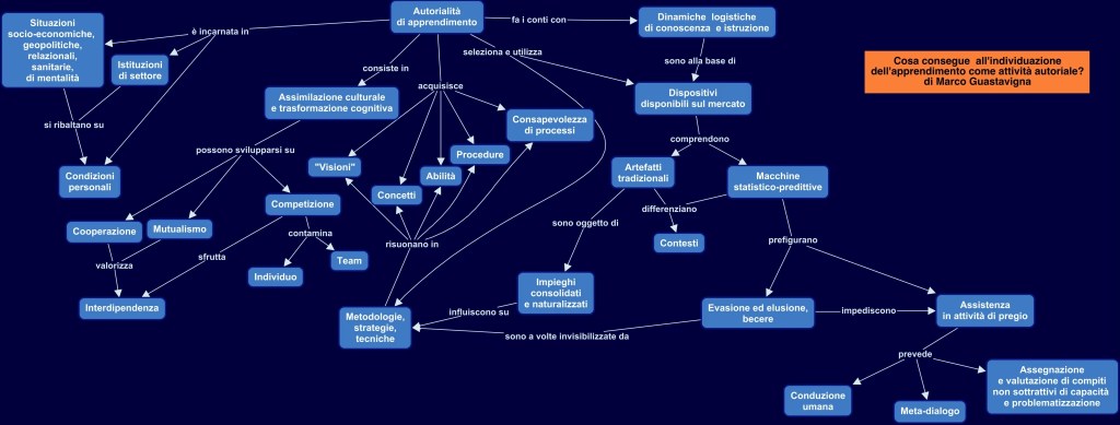 L’immagine non è un insieme casuale di parole, ma una rappresentazione visiva di un pensiero complesso, tipica delle mappe concettuali. Marco Guastavigna (esperto di didattica e mappe) usa questo strumento per evidenziare come l’apprendimento autoriale sia un processo dinamico, interconnesso e contestuale.