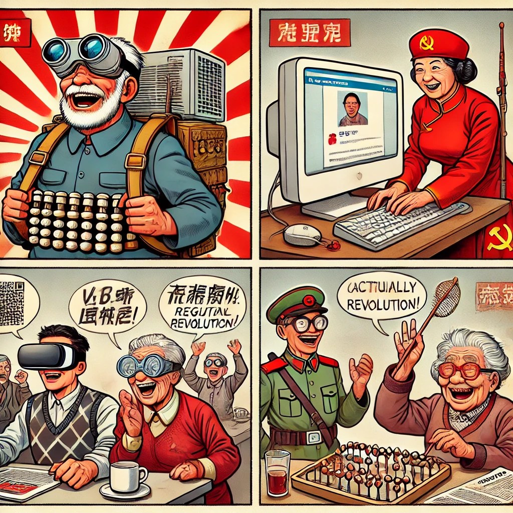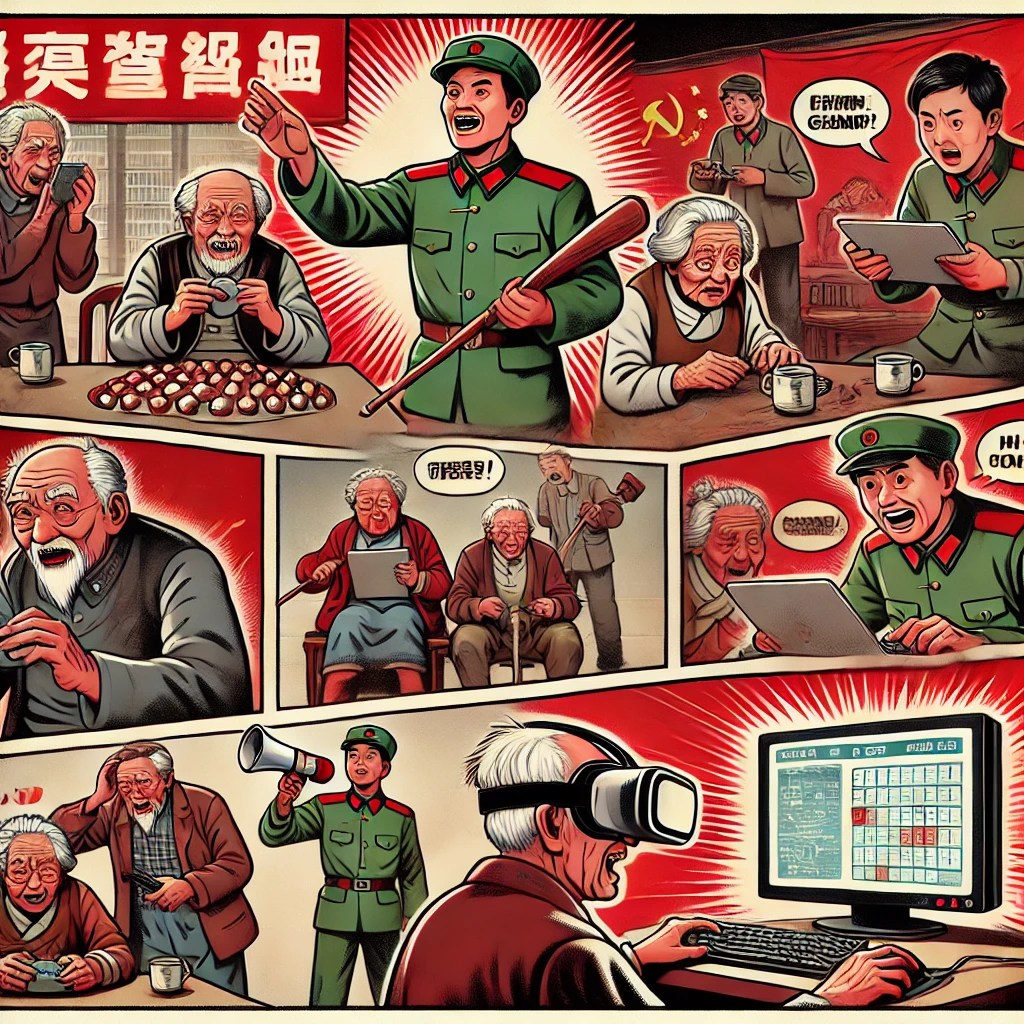 ChatGPT: Interessante idea! Creerò una serie di immagini in stile fumetto che racconta la storia di una comunità di anziani costretta dalle Guardie Rosse a usare i computer. Immagino un mix tra l’estetica della propaganda maoista e elementi tecnologici moderni, mantenendo un tono satirico e critico.