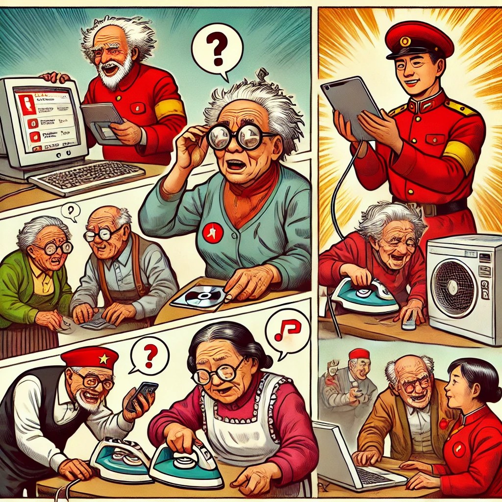 Ecco la prima immagine della storia a fumetti! 🎭📲 Mostra gli anziani costretti dalle Guardie Rosse a entrare nell’era digitale, con situazioni comiche come nonni che confondono la tecnologia con oggetti tradizionali.