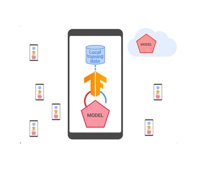 Illustration of federated learning with local data training on devices and model aggregation in the cloud, highlighting differential privacy concepts.