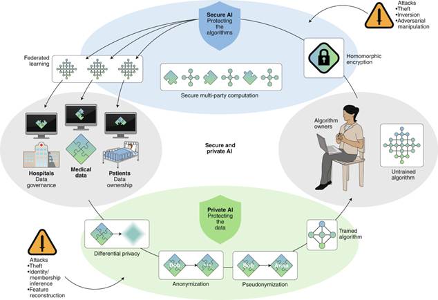 Diagram illustrating secure and privacy-preserving AI architecture using federated learning, multi-party computation, and data protection techniques like differential privacy and anonymization.