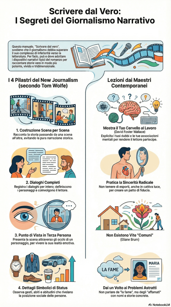 In sintesi, la tesi centrale è che il giornalismo deve aspirare a una qualità letteraria per adempiere al suo compito di raccontare la realtà al meglio, e questa ambizione si realizza attraverso l’apprendimento e l’applicazione cosciente di tecniche narrative.