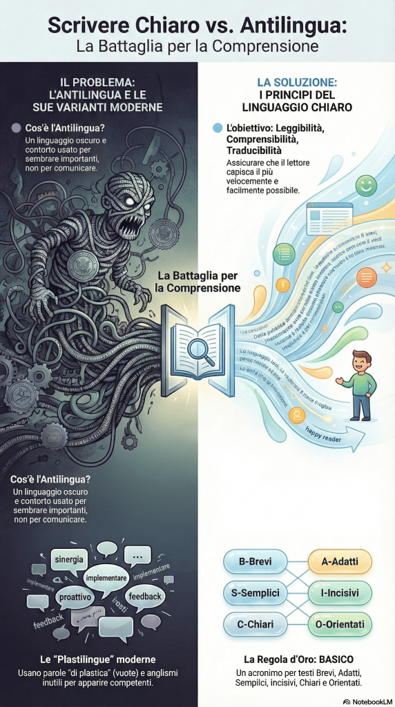 Scrivere chiaro e semplice è come progettare un sentiero in montagna: se lo tracci in linea retta, è veloce ma ripido e accessibile solo agli esperti (linguaggio specialistico); se lo contorci con burocratese e plastismi, è lungo e ci si perde (antilingua). Il linguaggio chiaro è come un sentiero ben strutturato, con pendenze dolci e segnaletica evidente, che permette a chiunque (dal camminatore occasionale all’escursionista) di raggiungere la vetta (la comprensione) nel modo più efficace.