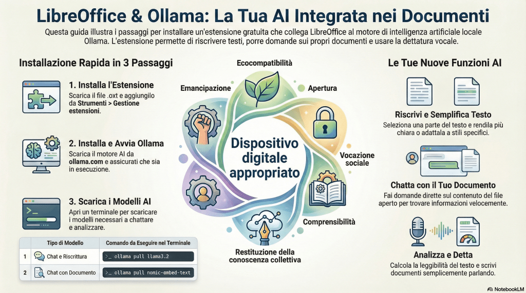 Questa estensione integra le potenzialità dell’Intelligenza Artificiale (Ollama) direttamente in LibreOffice Writer, offrendo strumenti per la riscrittura, l’analisi e l’interazione con i documenti.
