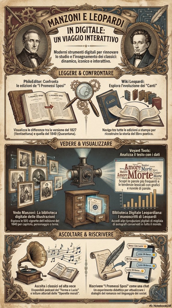 - Si propone l’ascolto di letture espressive (disponibili ad esempio nelle edizioni digitali Edimedia) per focalizzare elementi testuali che sfuggono alla lettura silenziosa. Questo approccio è utile sia per i Canti (per marcare la polifonia delle voci) sia per le Operette morali, di cui si enfatizza la “recitabilità” e la componente ironico-teatrale.