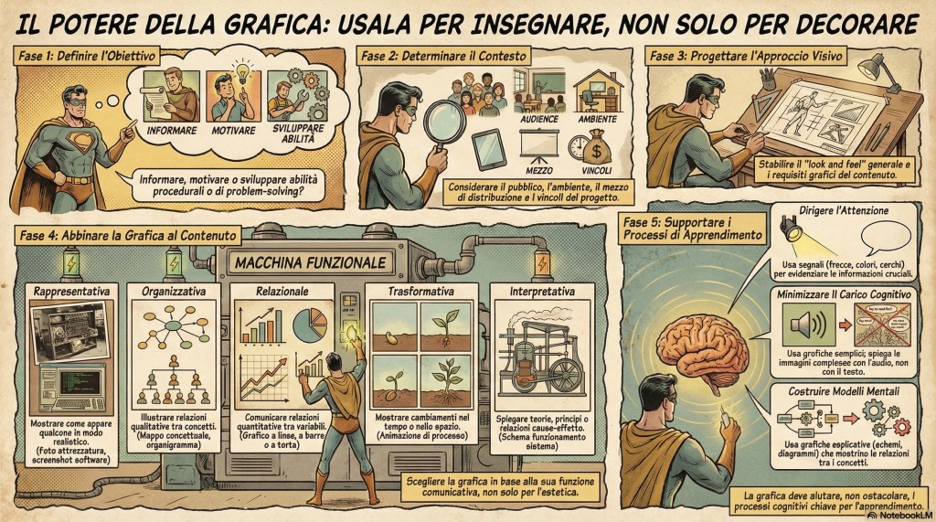 Un principio fondamentale del design didattico, supportato da decenni di ricerca, è il “principio multimediale”: “Le persone imparano meglio dalla grafica e dalle parole che dalle sole parole.” Questa idea è la premessa centrale che guida l’uso efficace delle immagini nei materiali didattici.