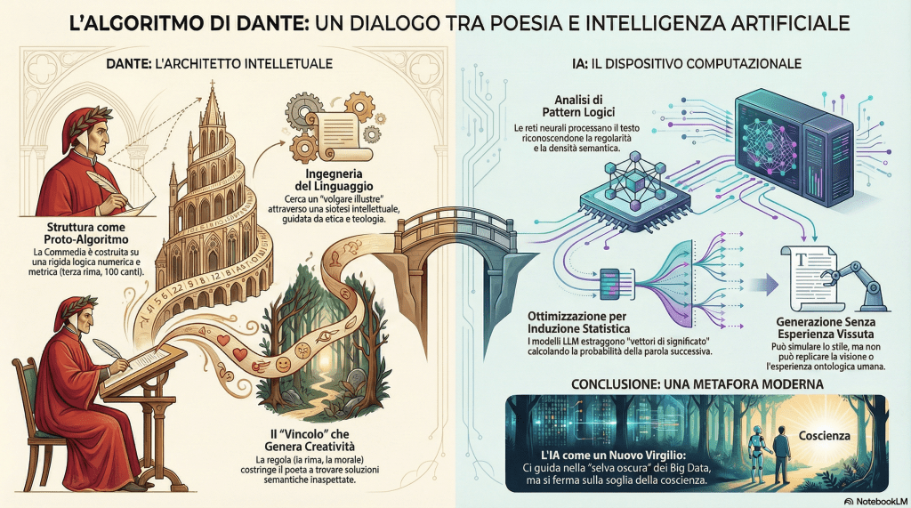 Nel panorama della letteratura mondiale, Dante Alighieri non rappresenta solo il culmine della cultura medievale, ma emerge come un architetto di sistemi complessi. La sua opera, in particolare la Divina Commedia, può essere interpretata come un immenso dispositivo di elaborazione simbolica e linguistica. Oggi, nell’era dell’Intelligenza Artificiale (IA), il rapporto tra la poetica dantesca e la tecnologia computazionale si rivela sorprendentemente fertile, non solo per l’analisi testuale, ma per la comprensione stessa della natura dell’intelligenza.