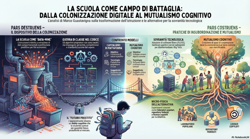 Il presente documento delinea una critica radicale alla trasformazione del sistema scolastico pubblico sotto la spinta del capitalismo di piattaforma. Basandosi sull’analisi di Marco Guastavigna, ex formatore e “ricercatore inopportuno”, emerge un quadro in cui la scuola è divenuta un “campo di battaglia” e una “miniera di dati” per gli oligopoli tecnologici (Big Tech).